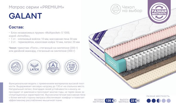 Функциональная модель с применением материалов высокой плотности. Выдерживает весовую нагрузку до 130 кг на спальное место. Натуральный латекс, благодаря своей устойчивости к износу, не проседает от давления и прослужит многие годы не теряя своих эксплуатационных характеристик. Высокоэластичная массажная пена с более мягкой стороны матраса обеспечивает комфорт и помогает эффективному расслаблению мышечной ткани.